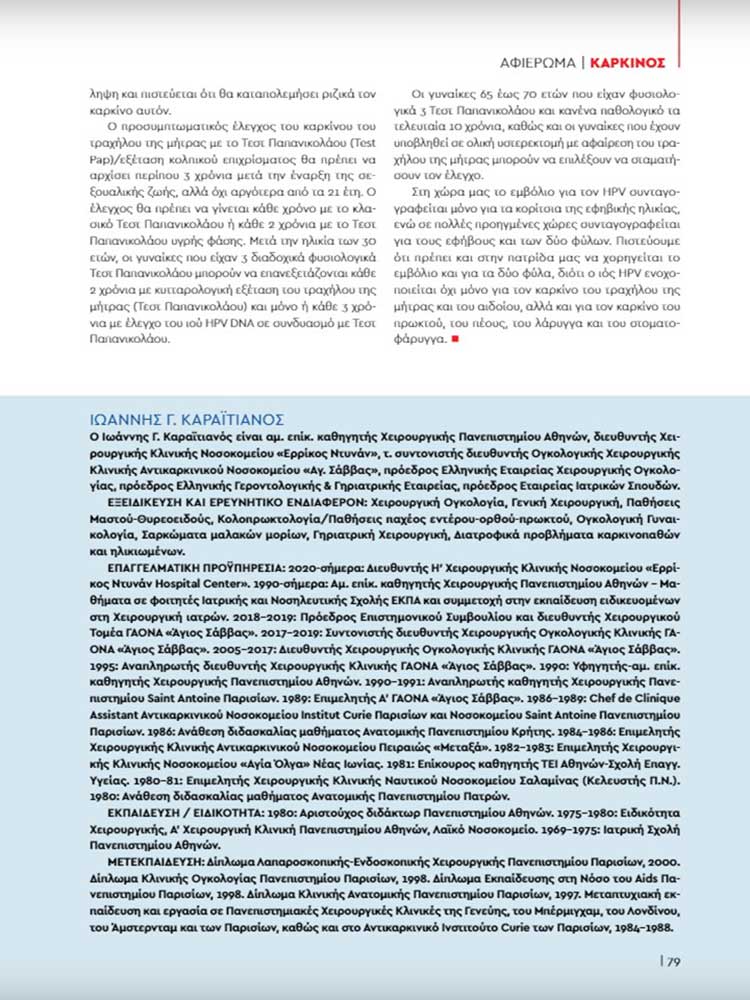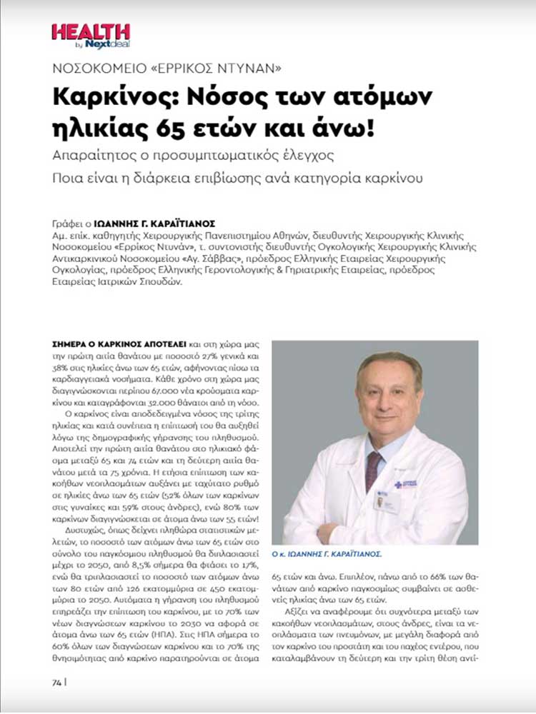 Μια αρκετά ενδιαφέρουσα συνέντευξη του Dr. Ιωάννη Καραϊτιανού (Αμ. Επίκ. Καθηγητή Χειρουργικής του Πανεπιστημίου Αθηνών, Διευθυντή της Χειρουργικής Κλινικής του Νοσοκομείου Ερρίκος Ντυνάν, τ. Αναπληρωτή Καθηγητή Χειρουργικής του Πανεπιστημίου Saint Antoine Παρισίων, Προέδρου της Ελληνικής Εταιρείας Χειρουργικής Ογκολογίας, Προέδρου της Ελληνικής Γεροντολογικής και Γηριατρικής Εταιρείας) που επικεντρώνεται στον καρκίνο ατόμων 65+, καθώς αποτελεί νόσο κατεξοχήν της τρίτης ηλικίας, φιλοξενεί η ιστοσελίδα NEXTDEAL στη θεματική της ενότητα Υγεία Nextdeal με τον δημοσιογράφο Άρη Μπερζοβίτη.